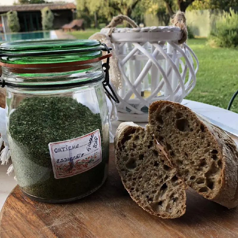 Qualche giorno fa mi e’ arrivata su FB la pubblicità di una farina per realizzare il pane alle ortiche, questa farina era aggiunta di ortica essiccata. Erano elencati i benefici dell’ortica  (e’ un diuretico, depurativo e tonico, abbassa la pressione, contiene calcio, potassio e silicio)…e fin qui tutto bene…ma quando sono andata a leggere cosa veramente conteneva mi sono venuti i brividi…non sto qui ad elencarli, ma ho pensato che avendo un bosco a disposizione avrei trovato sicuramente la mia ortica, biologica di sicuro! Cosi’ mi sono armata di doppi guanti e di una forbice e ho fatto man bassa…poi ho essiccato le foglie  e ridotto in polvere fino ad ottenere il mio bel vasetto da utilizzare con le mie farine e realizzare il mio pane alle ortiche che avevo in mente da un po’.